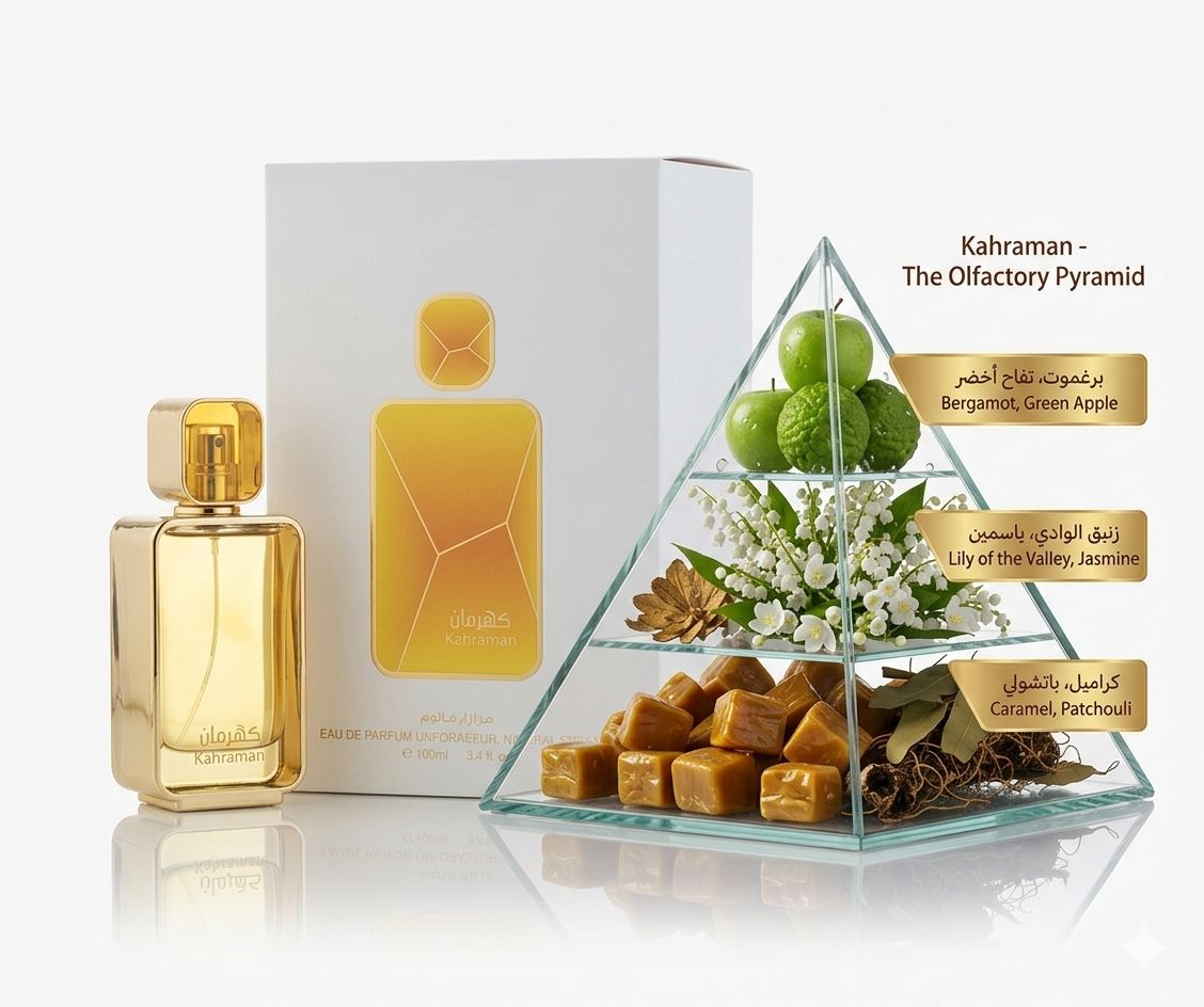 - عطر “كهرمان” ينطلق بنغمات عليا منعشة من البرغموت والتفاح الأخضر، يتوسطه قلب فوّاح من الياسمين وزهرة الوادي، ويستقر على قاعدة دافئة من الكراميل والباتشولي، مما يخلق توازنًا مثاليًا بين النعومة والدفء.